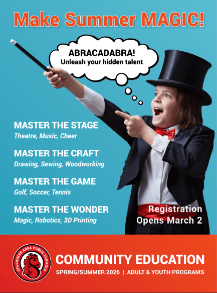 If you are new to our online registration system you will need to set up an account. Summer 2026 Registration Opens March 2 at 8 a.m. Youth Programs Youth Enrichment Youth Athletics Driver Education Aquatics Theatre Adult ProgramsAdult EnrichmentAdult Athletics School Age Care Adventure Club/Spin Early Childhood Early Childhood Family EducationPreschoolParent GroupsEarly Childhood Screening Facility Use Facility RequestUser must have a facility account to view calendar Cancellation PolicyIf you need to cancel a registration, you must notify us at 651-351-8300 or email stillwatercommed@stillwaterschools.org at least five (5) full working days before the class begins (unless otherwise noted). We will refund the class fee minus a $5.00 processing fee. Full refunds will be issued for classes that are canceled by Community Education. Refunds will not be given within five (5) working days of the start date, after the registration deadline has closed or after the class has started. This policy is necessary for us to provide the best service to our customers. We purchase supplies and commit to our instructors based on our enrollment. First Day of ClassMondayTuesdayWednesdayThursdayFridaySaturdaySundayCancel by 9am on:MondayTuesdayWednesdayThursdayFridayMondayMondaySlice 2026 Cancellation PolicyIn order for us to provide the best service to our customers, purchase supplies in a timely manner and commit to our instructors, we are implementing the following cancellation policy for all SLICE classes in July 2026. If you need to cancel a registration, you must notify us at 651-351-8300 or email stillwatercommed@stillwaterschools.org by June 30, 2026. We will refund the class fee minus a $5.00 processing fee. Cancellations received between July 1st and July 7th will be refunded 50% of the class enrollment fee. No refunds will be given after July 7th. Participant ExpectationsStillwater Community Education is committed to providing an environment that is safe, welcoming, respectful, caring and fun for all. To ensure this commitment, we pledge to respect differences, welcome diversity and promote inclusive practices. The success of our programs is dependent upon everyone having a mutual understanding of the expectations required to provide these opportunities. See a complete list of our participant expectations on our website at stillwaterschools.org/expectations.